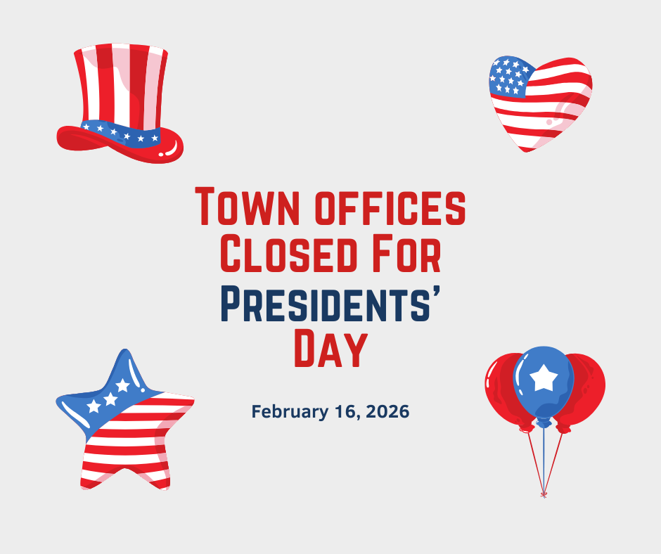 Please be aware, the Town Offices, including the Town Clerk’s Office, will be closed on Monday, 2/16/2026 for Presidents’ Day. Standard hours of operation will resume the following day, Tuesday, 2/17/2026.