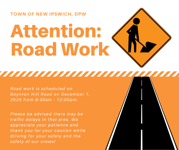 Boynton Hill Road will be closed for road construction from 9:30am - 12:00pm on Monday December 1, 2025.