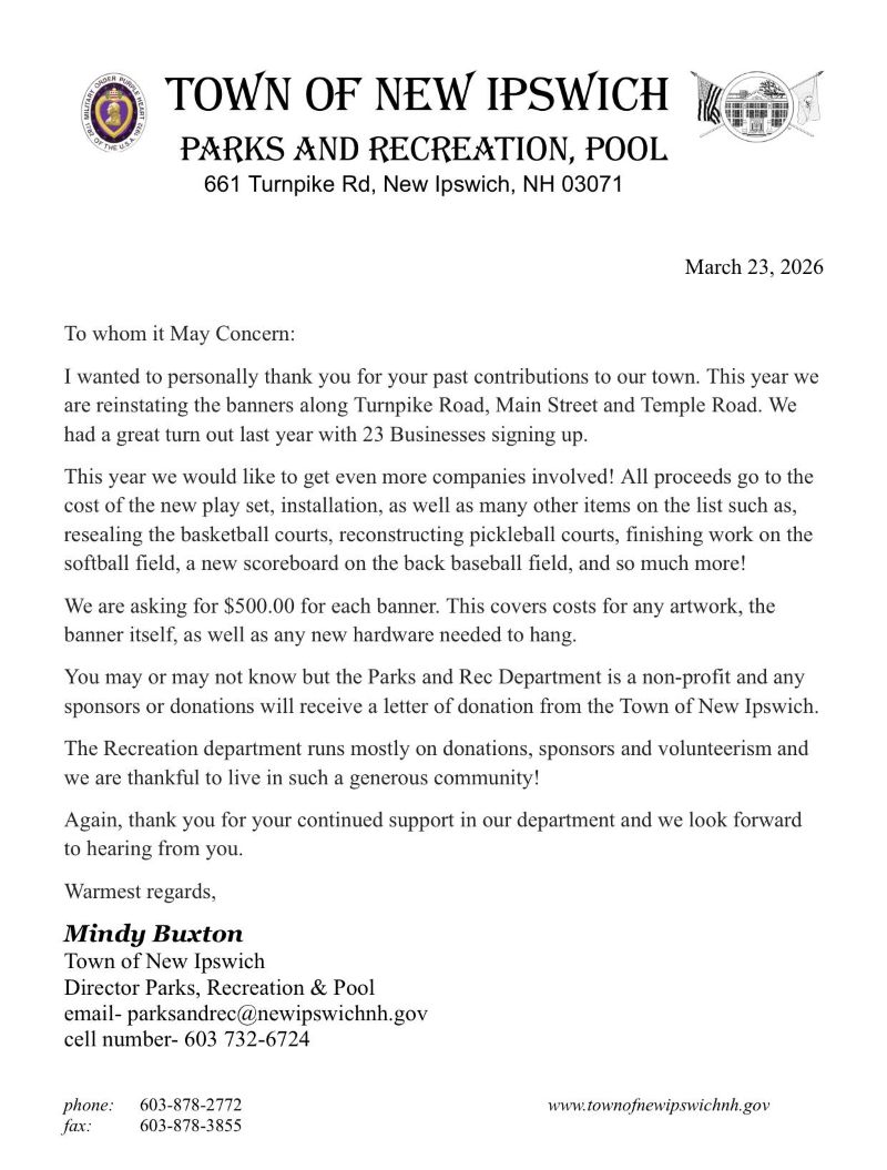We are pleased to offer advertisement banners along Main Street, Temple Road, and Turnpike Road this year to support the Parks & Recreation Department’s continued preservation of Memorial Park. We are looking forward to what we hope will become a continued opportunity to highlight locally owned businesses who recognize the need of the Town and this department and have committed themselves to giving back to their community.