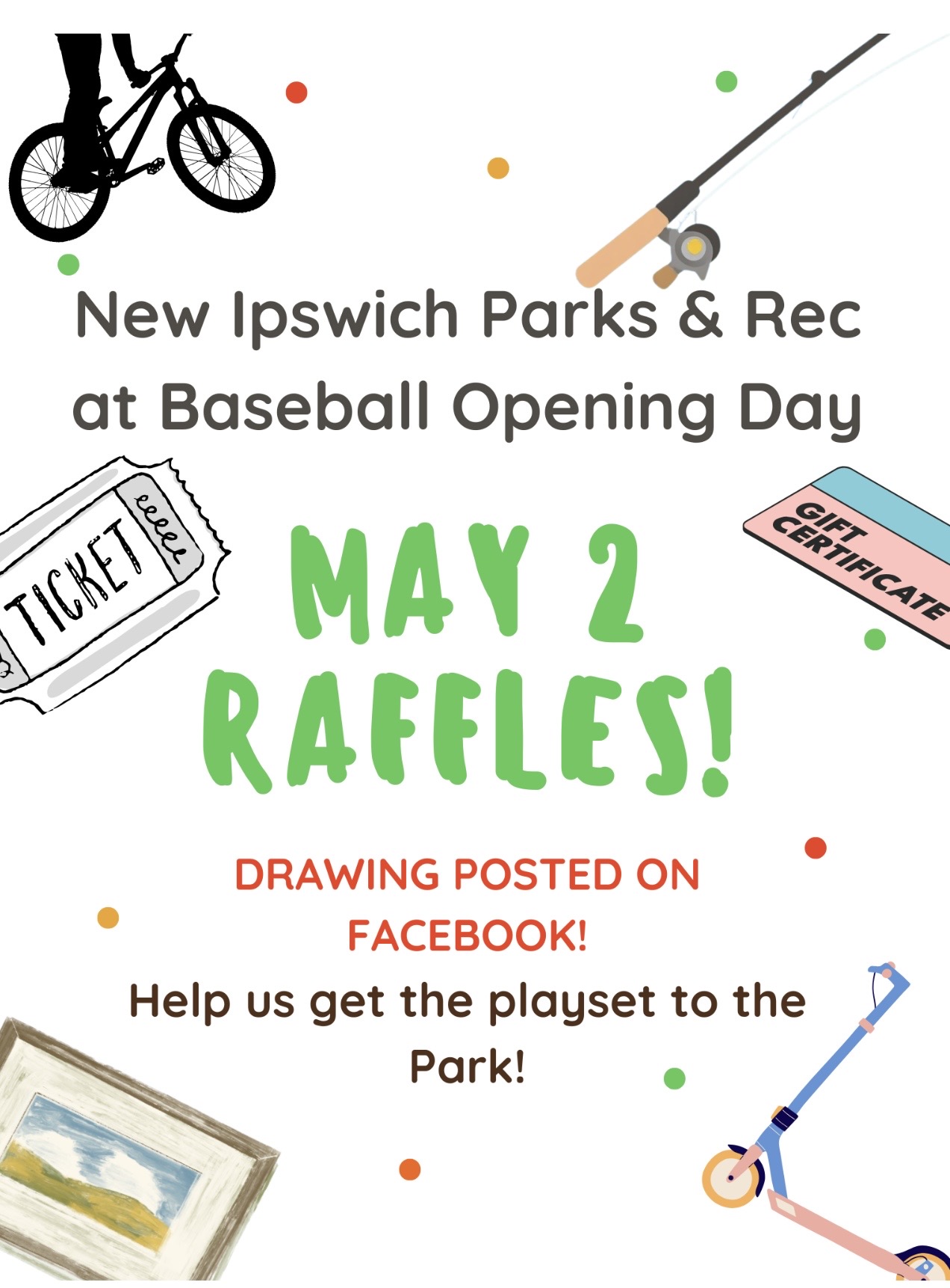 As you may know we had to remove our large play set at Memorial Park this year for safety compliance. In an effort to off set costs for the new playset, we will be fundraising and actively looking for sponsors. Baseball season is among us and Opening Day this Saturday at Memorial Park! We’ll be there to kick off our raffle sales and support our teams. Will you join us?