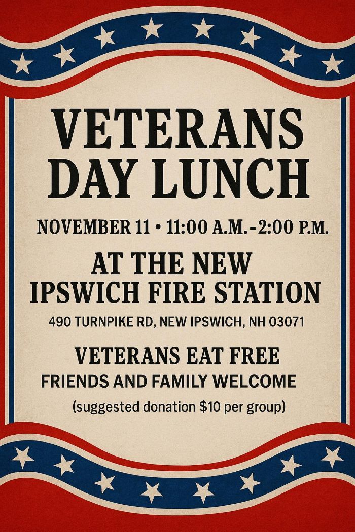 The New Ipswich Fire Department is inviting all veterans, their families, and community members to join us for a Veterans Day Lunch in honor of those who have served.